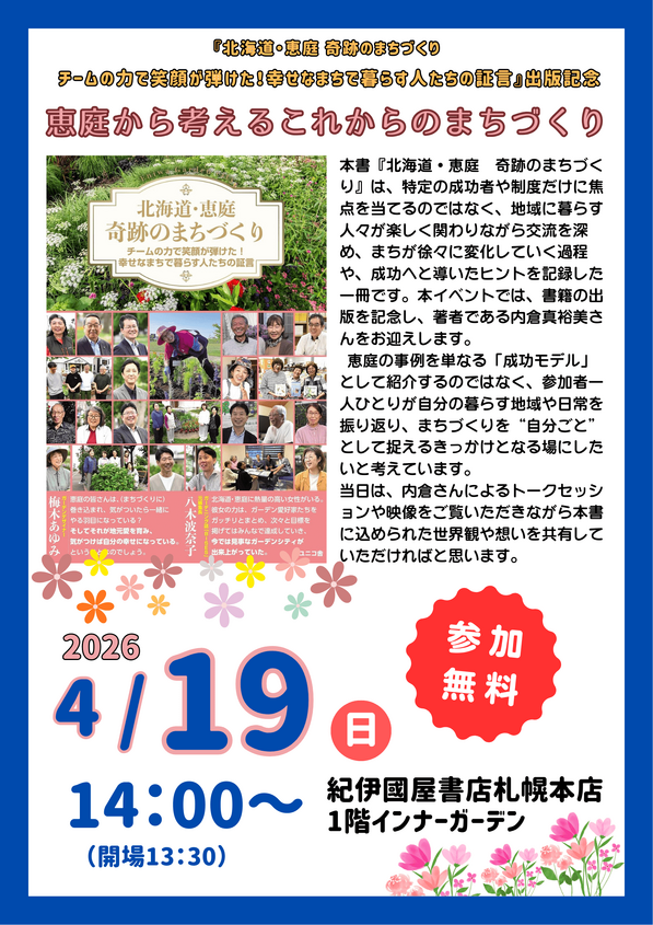 2026 4 19 日【札幌本店】恵庭から考えるこれからのまちづくり 「北海道・恵庭 奇跡のまちづくり チームの力で笑顔が弾けた!幸せなまちで暮らす人たちの証言」出版記念
