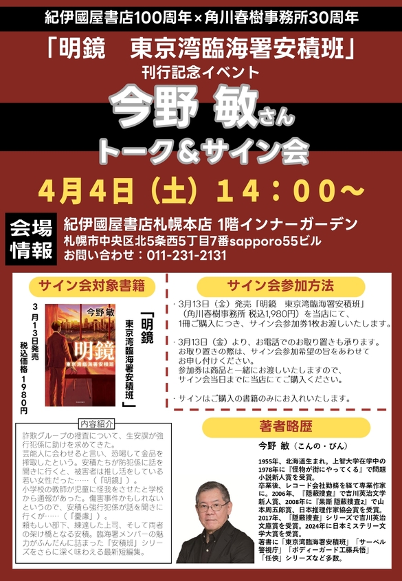 紀伊國屋書店100周年×角川春樹事務所30周年 「明鏡 東京湾臨海署安積班」刊行記念イベント 今野 敏さんトーク&サイン会