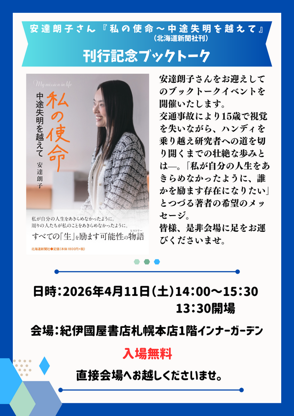 2026 4 11 土【札幌本店】安達朗子さん『私の使命~中途失明を越えて』(北海道新聞社)刊行記念ブックト-ク