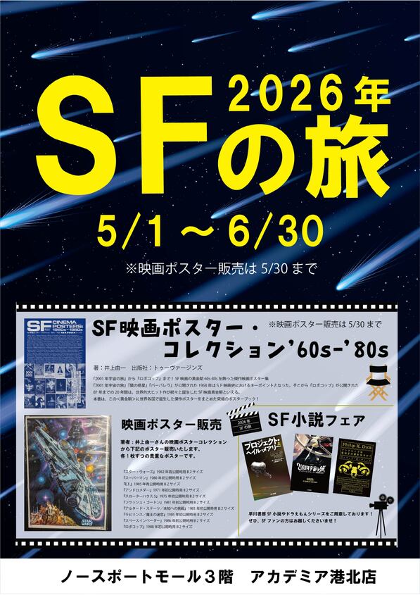 <2026年!SFの旅🚀📚> 5/1~SFフェアを開催します! 🚀SF映画ポスター販売いたします! ※貴重なポスターの為、売れ来次第終了です🙇‍♀️ 🚀早川書房 SF小説&グッズフェア 🚀藤子・F・不二雄&#ドラえもん SF(少し不思議)  フェア SFファンの皆様、ぜひお越しくださいませ😊 #スターウォーズ